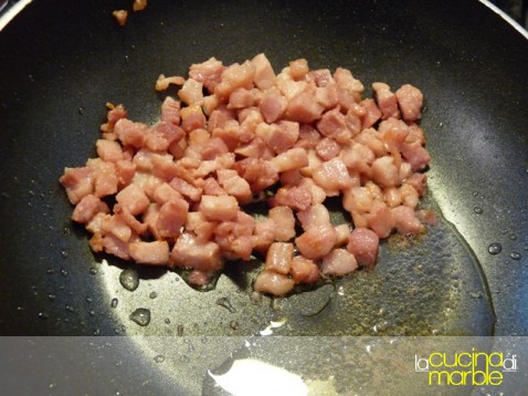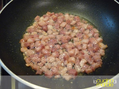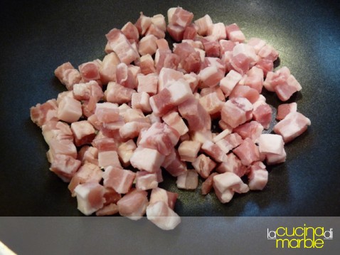 far rosolare in una padella antiaderente i cubetti di pancetta senza alcuna aggiunta di grasso