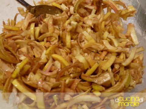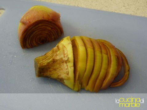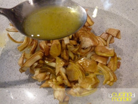 mondare e tagliare i carciofi, condirli con la vinagrette preparata