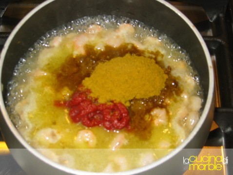 aggiungere un po' d'acqua, della conserva di pomodoro e del curry