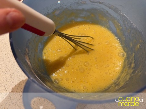aggiungere alle uova lo zucchero, mescolare bene, magari con l'aiuto di una piccola frusta. considerate che il composto non dovrà montare, la frusta però aiuta ad amalgamare meglio il tutto